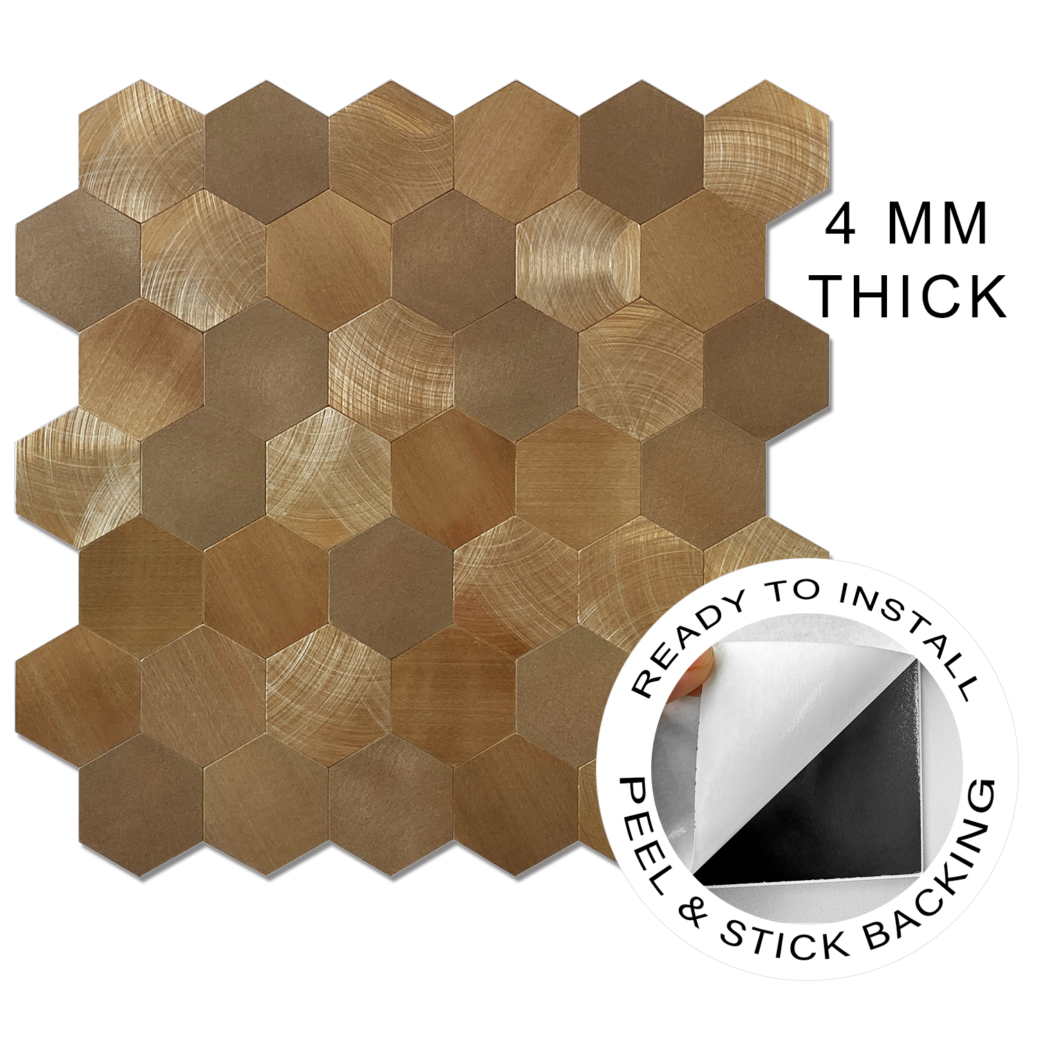 Donnez un style moderne et chaleureux à vos murs avec les plaquettes mosaïque auto-adhésives Brons Hexagonal : un motif hexagonal bronzé élégant, une pose rapide et une résistance optimale.