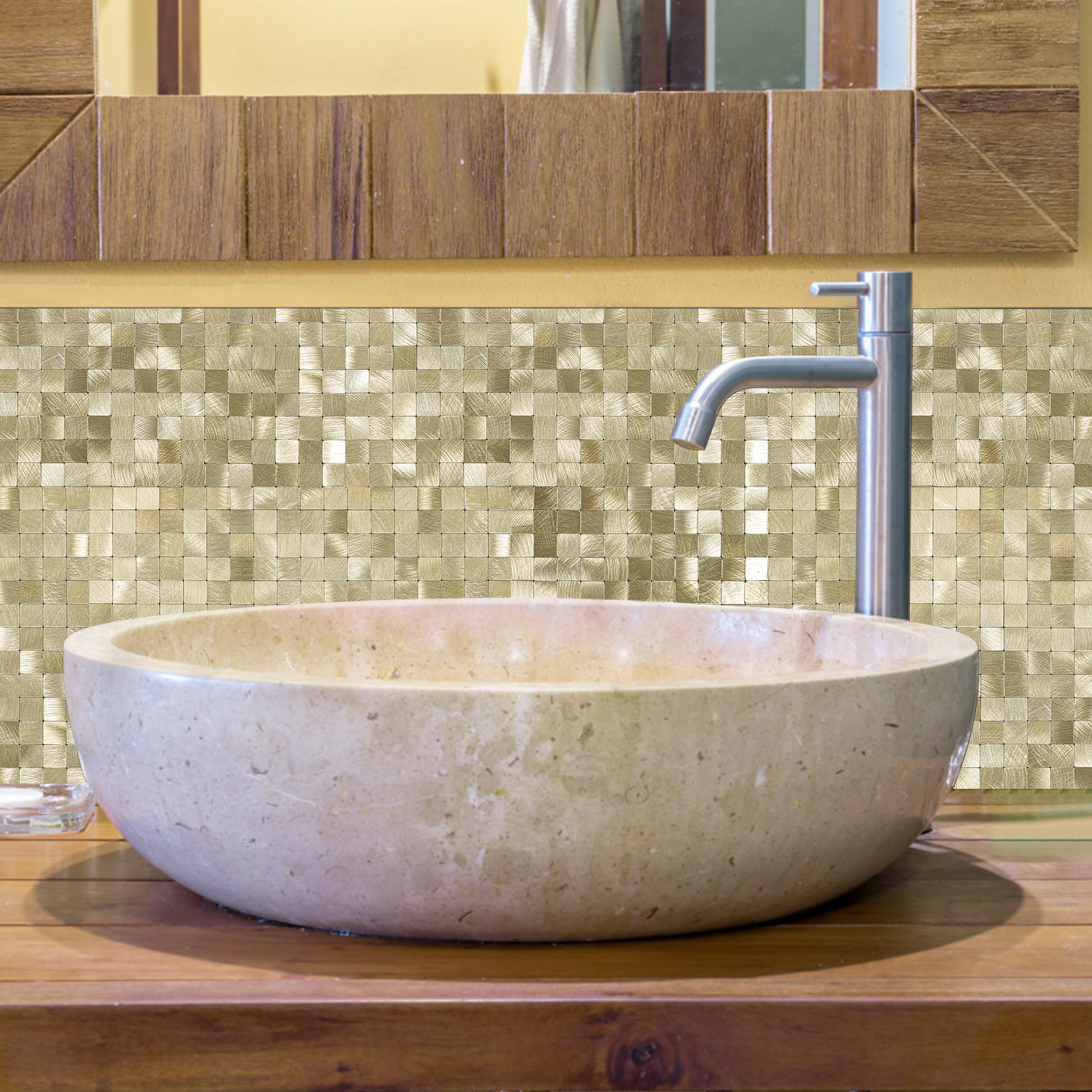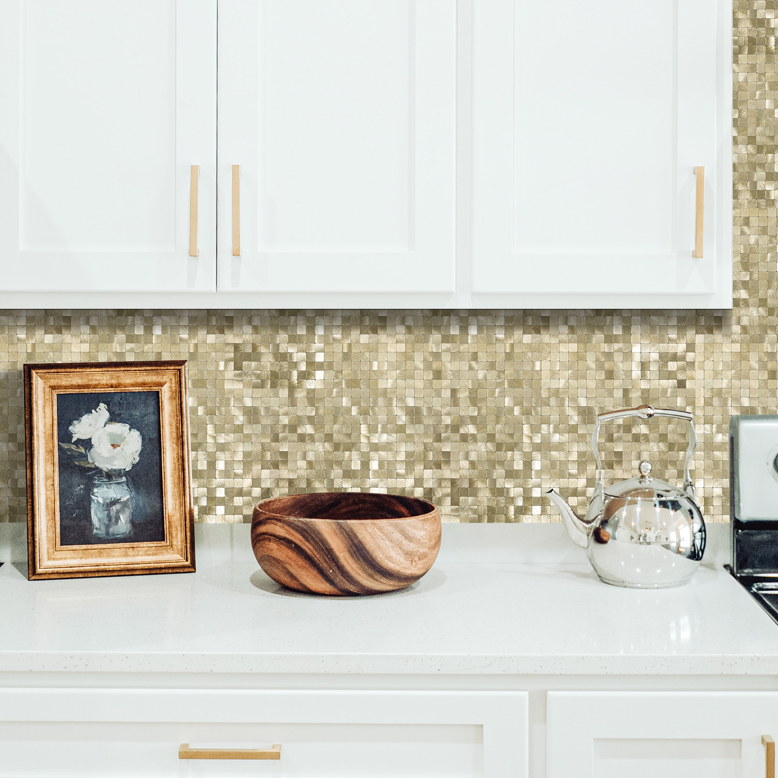 Ajoutez une touche dorée élégante à votre intérieur avec les plaquettes mosaïque auto-adhésives Brushed Gold Mini : un motif mini-mosaïque en métal brossé, une installation rapide et une finition durable.