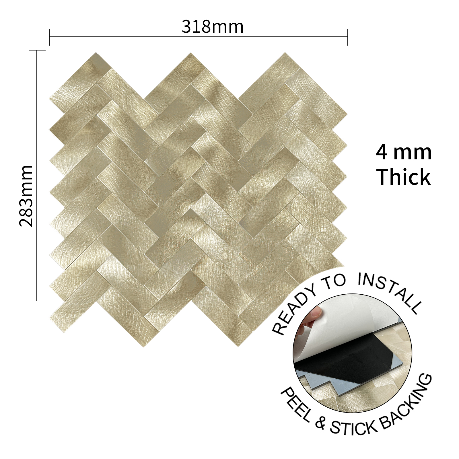 Le motif chevron doré (Herringbone) crée un effet visuel dynamique, sophistiqué et lumineux, idéal pour moderniser une cuisine, une salle de bain (hors douche), un salon ou un espace professionnel.