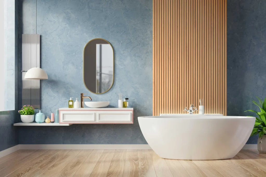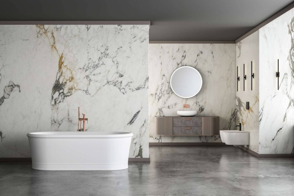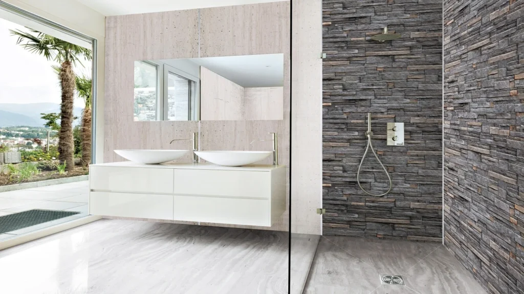 Les dalles résistent bien à l’humidité, ce qui les rend parfaites pour des espaces comme la salle de bain – à condition qu’elles ne soient pas directement exposées à l’eau (comme dans une douche). Pour les zones avec contact direct à l’eau, optez plutôt pour nos panneaux muraux résistants, effet marbre ou pierre naturelle.